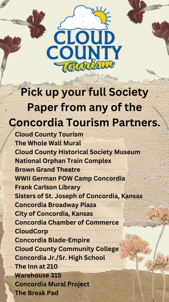 This author is deeply indebted to Janet Emery’s collection of Concordia’s stories and the book in which she compiled them. Her commitment to capturing the voices of those with incredible stories to tell, before they were lost, is an inspiration to those who wish to continue that work – a true treasure to the citizens of Cloud County and Concordia.