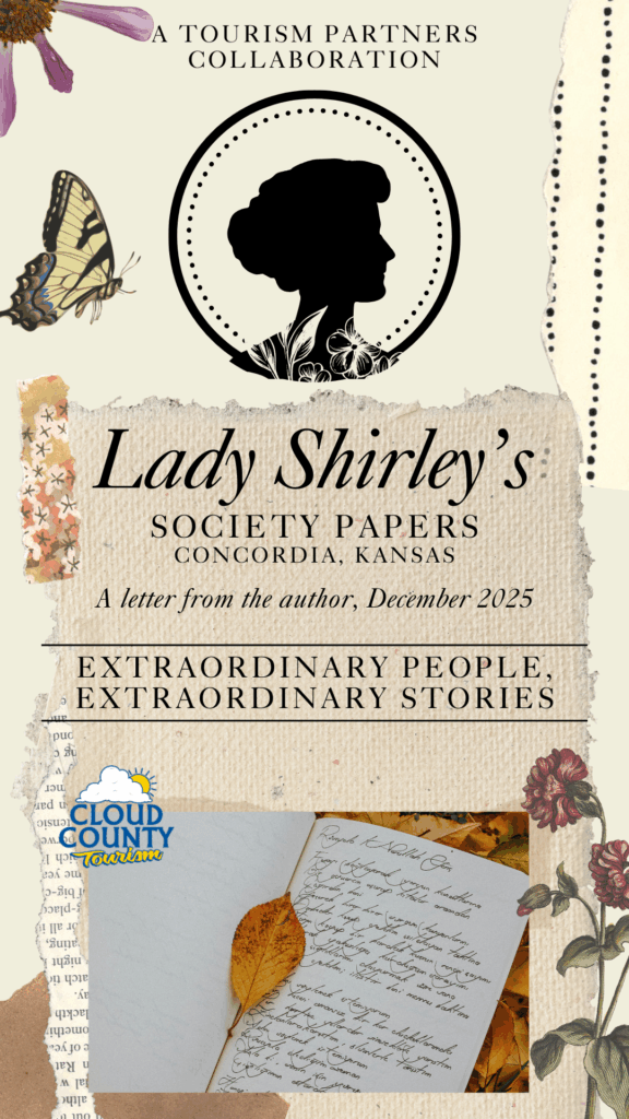 What a whirlwind of a year it has been sharing Lady Shirley’s Society Papers! Who knew Spilling the Tea in Concordia could be so entertaining! We hope you’ve enjoyed Lady Shirley’s tales of intrigue and sometimes scandal. This month she honors two local storytellers who have shared so much of our local history that we should all be grateful they took time to write them down. Without those tales so much would be lost to time and forgotten. She also invites us to write our own stories down. We all have a story to share. Most of those who have played the biggest roles in our histories didn’t even realize how important their stories were at the time.