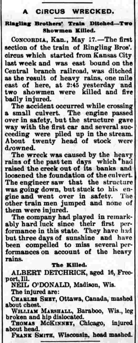 On a Tuesday in 1892, May 17th to be exact, years before the previous story, tragedy struck the Circus as it was leaving Beloit, Ks, traveling through Concordia, to set up in Washington, Ks. The circus would then plan to return to Concordia for Wednesday’s show. However, the circus never made it to Washinton. It had been raining for about 10 days and due to the conditions, several shows had already been cancelled. The 40 car, Ringling Brothers Circus train was heading over a small waterway about a mile east of the railroad’s depot. The rains had flooded creeks and filled the culverts and ditches. Knowing the show must go on, the train was allowed to continue on so that it would not miss the next stop. A flood-weakened culvert was just ahead. Though the conductor saw the impending culvert, there was no time to stop.