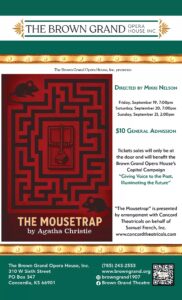 For the Brown Grand Theatre’s 118th Birthday celebration, the Brown Grand Players are proud to present “The Mousetrap” by Agatha Christie, Directed by Mikki Nelson September 19-21 at the Brown Grand Opera House in downtown Concordia.