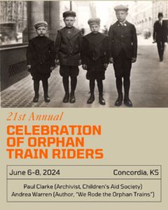 The National Orphan Train Complex’s annual Celebration of Orphan Train Riders is not to be missed! For three days in June, Orphan Train Rider descendants, genealogists, and history enthusiasts gather in the town of Concordia, Kansas to celebrate and remember the children who rode the orphan trains. Presentations from the National Orphan Train Complex staff, special guest author Andrea Warren, and keynote speaker New York Children’s Aid Society archivist Paul Clarke are highlights of the event. Plus, new Orphan Train Rider statue plaques and window coverings will be revealed, the DAR will make a presentation, descendants of Orphan Train Riders will share stories, and a special movie will be shown at the movie theatre Friday night. All this excitement will create an appetite, but not to worry… a catered reception and a banquet lunch are both included in the ticket price! Go to https://orphantraindepot.org/2024-celebration…/ for a Registration Packet or call the museum at 785-243-4471 for more details.
