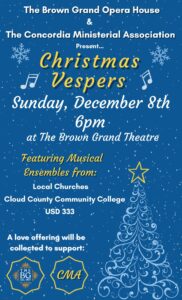 The entire community is welcome to join us at the Brown Grand Opera House for the return of Christmas Vespers. This is a beloved holiday tradition in Concordia, and we hope you will join us to celebrate the Christmas season with music, scripture, and a brief sermon. Church musicians from across Cloud County will perform, as well as performing groups from Cloud County Community College, and USD 333.
