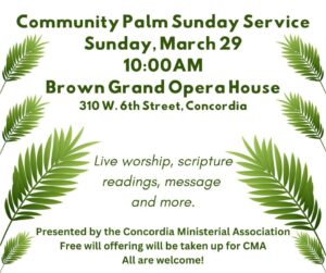 For the fifth year in a row, the Concordia Ministerial Association will be hosting a Community-Wide Palm Sunday Service at the Brown Grand. All are welcome to join us for this meaningful service, where local churches come together for a time of worship and teaching. This event is free and open to the public. A free will offering will be collected to support the efforts of the Concordia Ministerial Association.