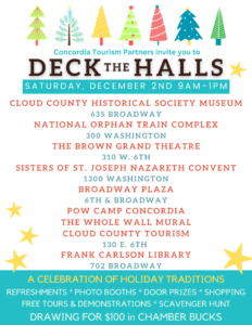 Deck the Halls is back for its second year and this year we are focusing on traditions. Fun traditions, quirky traditions, and stories behind ones we consider common, we’ll have a little of everything as we celebrate this year. Maybe you’ll find a new tradition to incorporate in your holiday celebrations as well! Make your way through each tourist attraction in Concordia and have a great time with your friends and family.