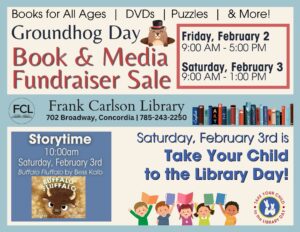 To celebrate “Take Your Child to the Library Day”, the Frank Carlson Library will host a Saturday Storytime event 10:00am on Saturday, February 3rd. Our annual Groundhog Day Book Sale Fundraiser will also be open in the Frank Carlson Room.