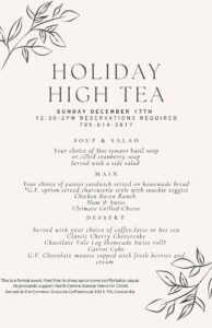 Join us for our last fundraising event of the year. Our holiday high tea! Reservations are REQUIRED by calling or texting Amber 785-614-3817