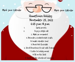 Hometown Memories are made during our annual Hometown Holiday Celebration. Santa arrives in town to light the Christmas Tree. Stroll downtown and take advantage of Holiday Savings at many retail locations, while enjoying Festive Music on our new speakers. Children have the opportunity to visit Santa and create lasting memories doing all the fun Holiday activities that you remember as a child. So, mark your calendars! Details will follow when finalized! Several stores will be participating by offering things to do and see!