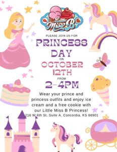 We are having a Princess Day next weekend, October 12th! Wear your prince and princess outfits and enjoy a free cookie and take pictures with our Little Miss B Princess!
