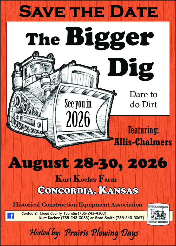 The Historical Construction Equipment Association International Convention and Old Equipment Exposition 35th Annual The Big Dig, was hosted by Prairie Plowing Days, Concordia KS. The HCEA’s annual International Convention and Old Equipment Exposition is a gathering of antique construction machinery, trucks and related equipment for the general public. The show features live demonstrations of these machines, with technology spanning from the late 1800s to the mid to late 1900s. Exhibitors bring equipment from hundreds of miles away to these shows, and attendees come from around the world. Concordia was honored to host this event in 2021. HCEA, headquartered in Bowling Green, Ohio, picks a location where the event will be held each year.